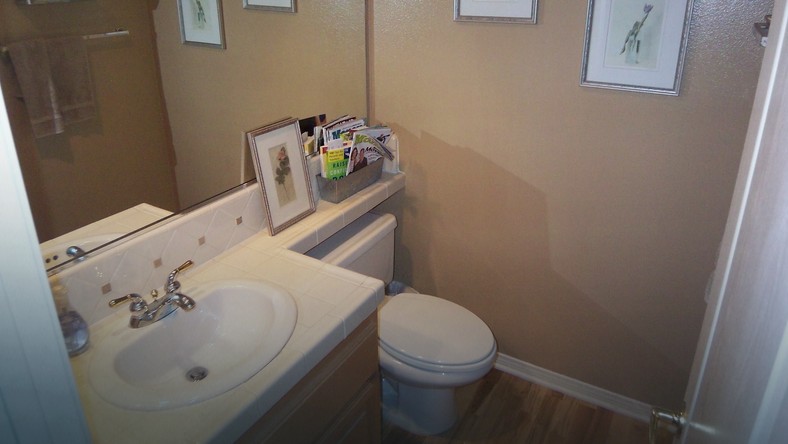 Po lewej stronie słata pralka, która zajmowała połowę wejscia do łazienki a toaleta.